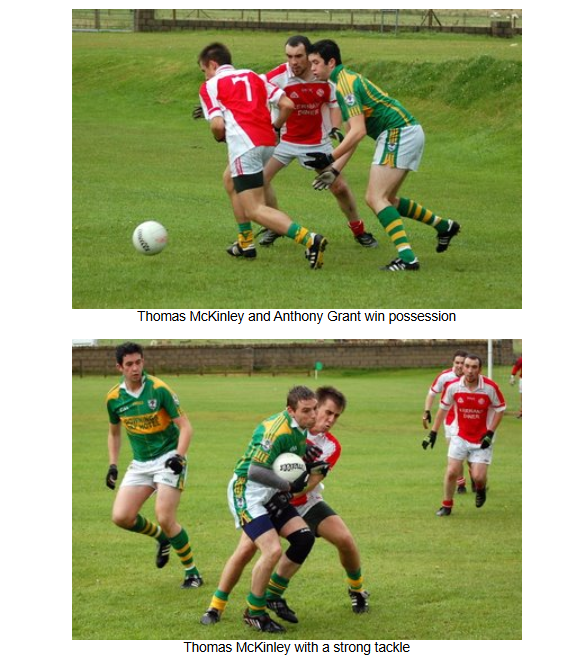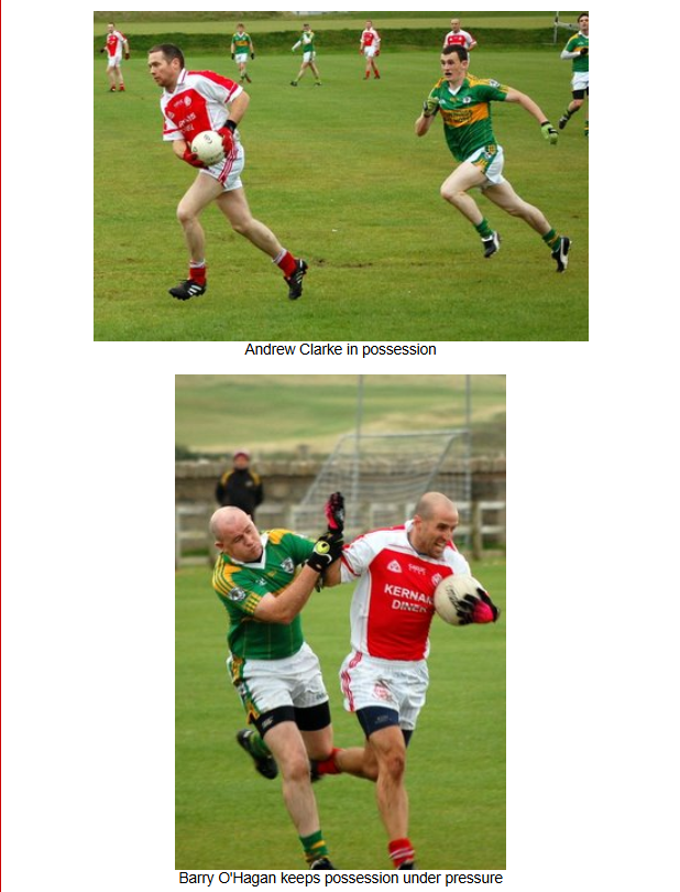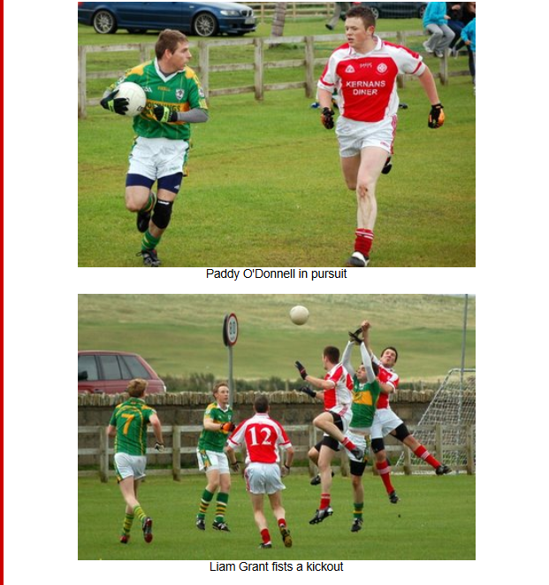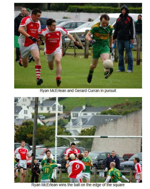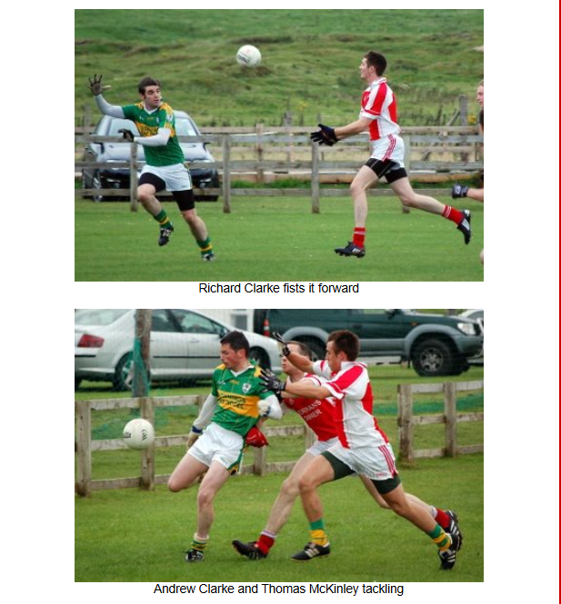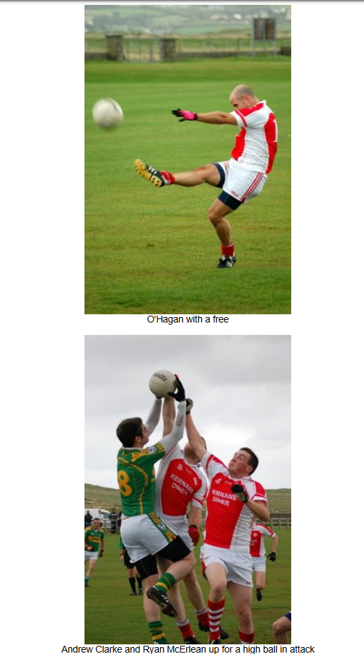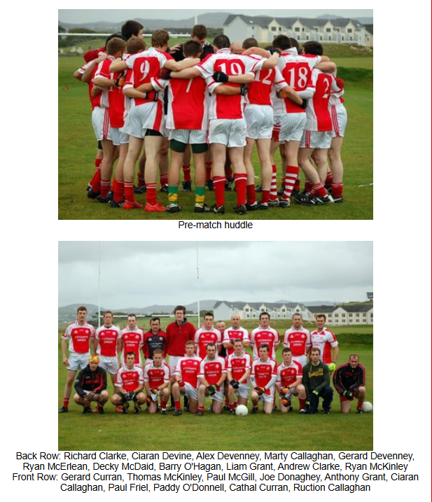 The home side took full advantage of the swirling wind at their backs the and the wet conditions and sent the ball long into the full forward line at every opportunity, giving the Naomh Colmcille backs a wave of difficult balls to deal with. The Downings attack were clinical with their scoring opportunites and went on to score 3 further goals and 4 points in the first half. Naomh Colmcille could only add one more point to their early scores with a free from Barry O’Hagan.