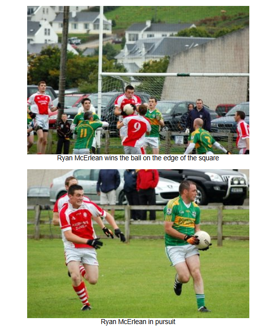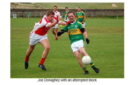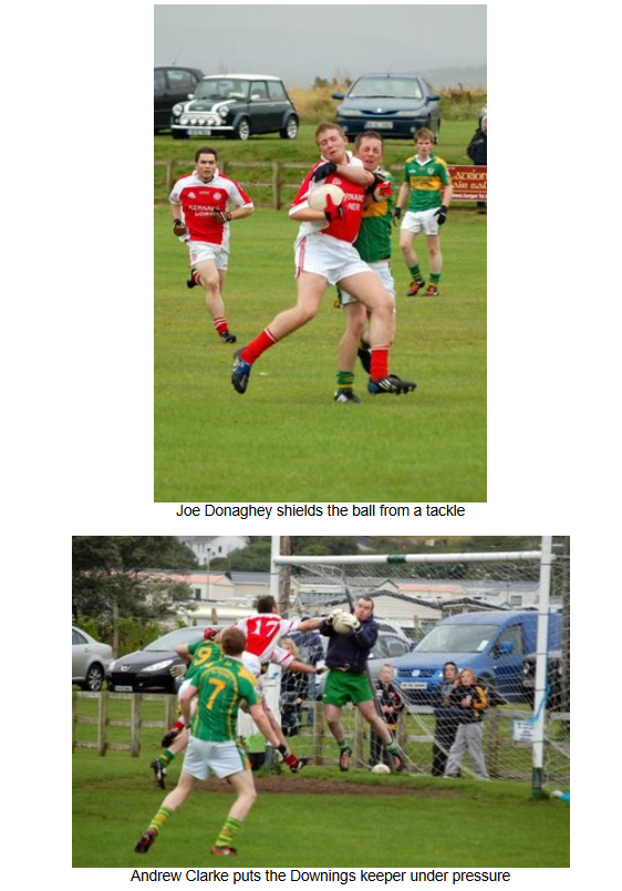 In the second half Naomh Colmcille put huge pressure on the Downings defense, but the home side dealt with the conditions better than the visitors, and were resolute in their defending, dealing well with the high ball into their full back line and getting in several last ditch blocks on goal efforts.