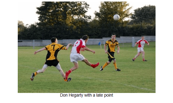 The third quarter followed the same pattern as the first half, with the teams exchanging scores and neither team able to carve out a lead. Aiden Friel was again accurate from two frees, and Darky Callaghan pointed after a great run and goal effort from Don Hegarty was blocked down.
