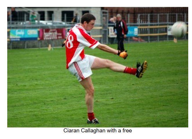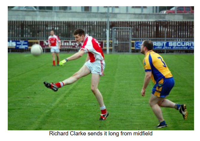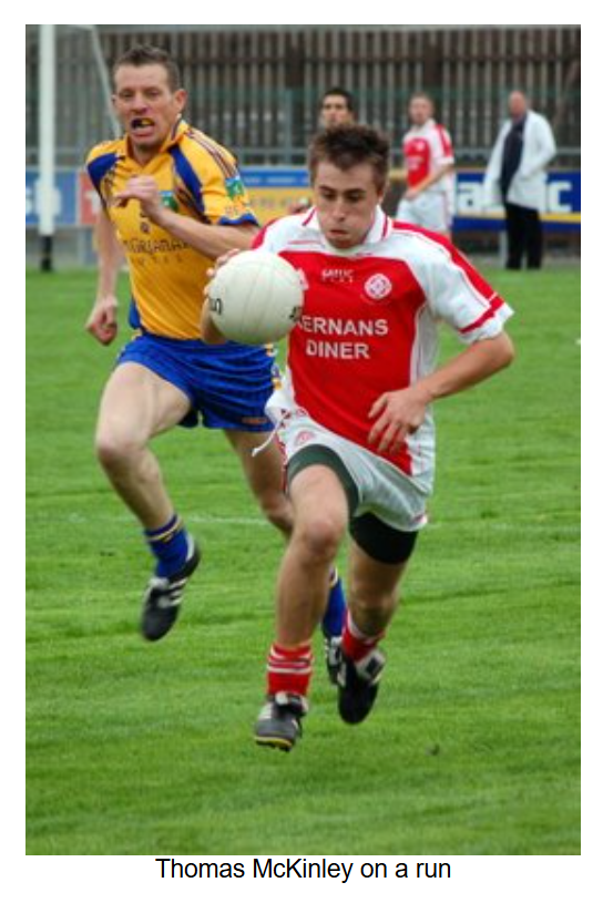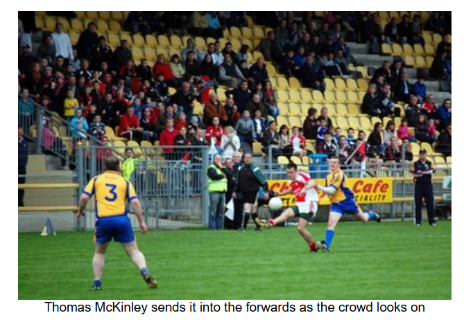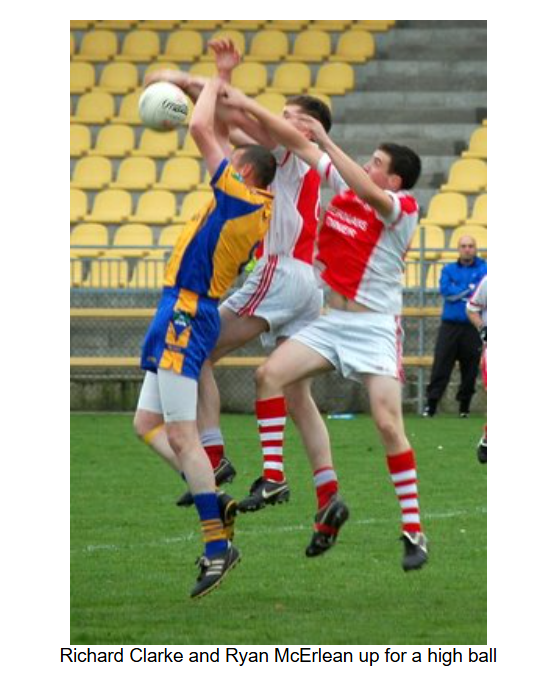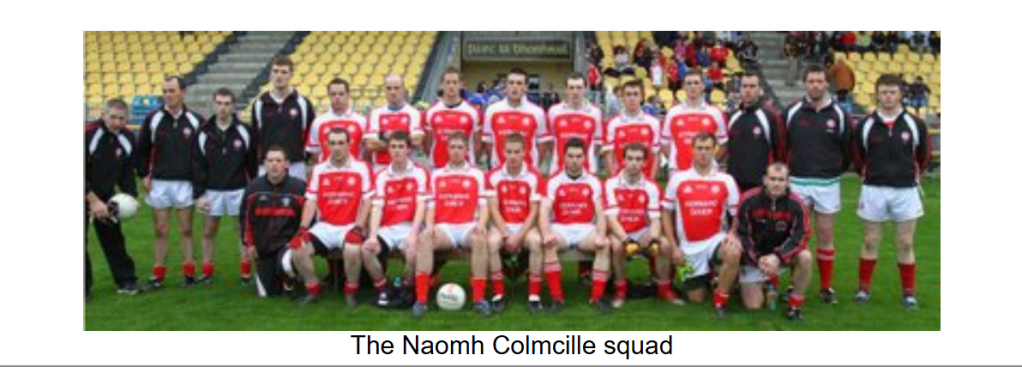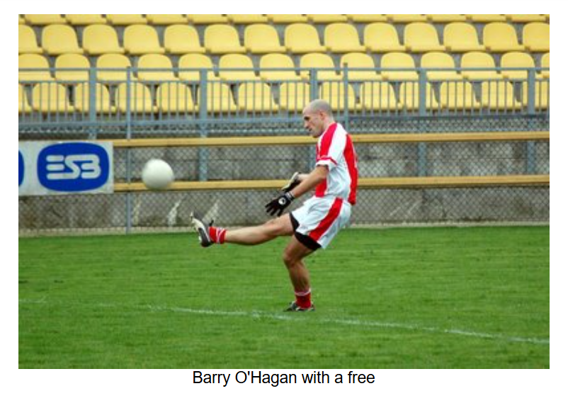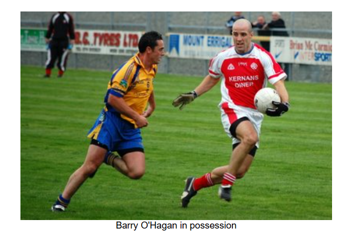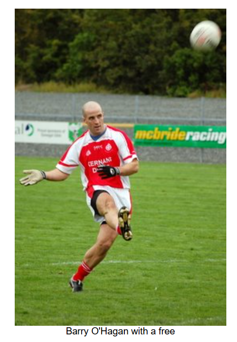 As the game entered the final quarter, a bad injury to the Burt number 8 resulted in a 5 minute delay. When play resumed, Burt converted two frees to take a one point lead. Eddie Gillespie came on for Anthony Grant. Barry O’Hagan got the scores back level with a point after Ryan McErlean was pulled down, but as the game went into injury time, Burt got a point from play to edge out in front again. As Naomh Colmcille desperately sought an equaliser, Ryan McErlean was pulled down 30 metres out. With injury time alsmost up, Barry O’Hagan stepped forward and put the ball over with the last kick of the game to draw the match at 2-04 to 1-07.