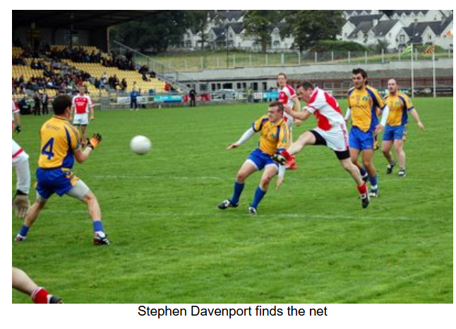 Unsurprisingly, it took Naomh Colmcille a few minutes to adjust to the new line up and positions, but they quickly set about their task, with Barry O’Hagan getting their first point on the board on 10 minutes. The first quarter was a cagey affair, with neither side creating many scoring opportunities, until Stephen Davenport found the net for Naomh Colmcille. Ciaran Callaghan started the move in the half back line and worked it through Ciaran Devine in the centre, who laid it off to Davenport, who drove the ball into the corner from the 13m line. Barry O’Hagan followed up with a free after Thomas McKinley was brought down as it appeared that Naomh Colmcille were beginning to get the upper hand. Indeed, Davenport nearly found the net again, but the Burt keeper pulled off an excellent save to turn the ball around the post low to his right. This proved to be a crucial save, as Burt pulled back two points at the end of the thalf to leave the scores at 1-02 to 0-3 at the break.